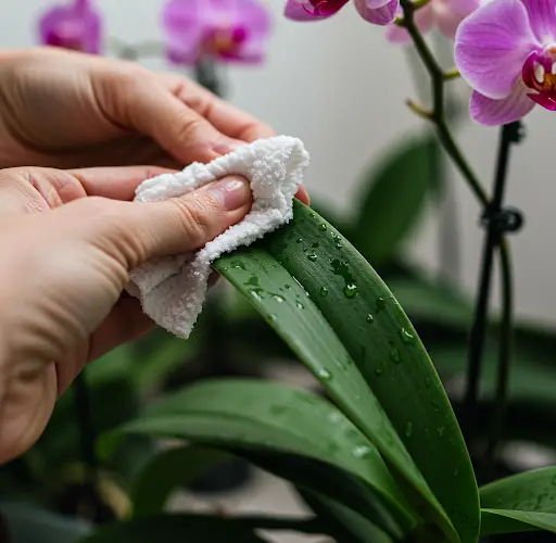 - Limpe delicadamente as superfícies superior e inferior das folhas da orquídea.