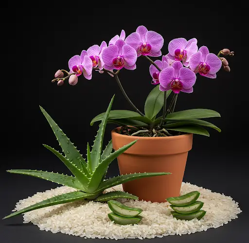 Após três semanas, é hora de nutrir sua orquídea com um fertilizante líquido potente feito de arroz e aloe vera.