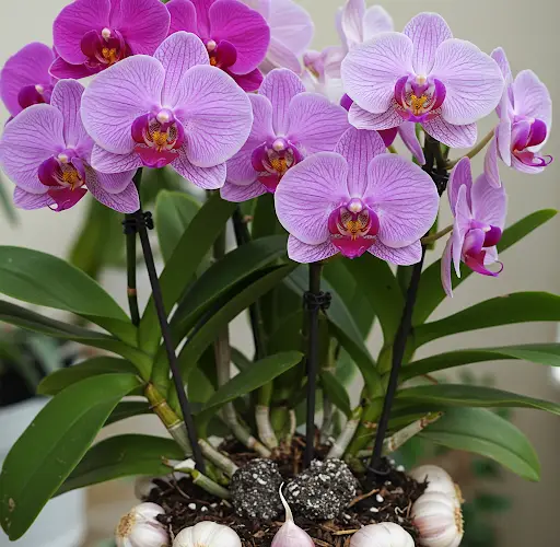- O alho ajuda a prevenir o apodrecimento das raízes e infecções fúngicas que podem danificar as orquídeas.