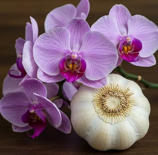 O alho é um poderoso desinfetante natural e estimulador do crescimento de orquídeas. Para preparar a solução de alho: