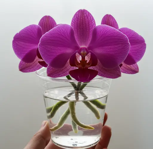 Após a conclusão do processo de imersão, retire a planta e deixe-a secar completamente. Use dois copos plásticos — faça furos em um para ventilação e corte um pedaço do outro para acomodar a orquídea com segurança. Durante os primeiros 3 a 5 dias, use água da torneira, certificando-se de que apenas a parte inferior das folhas e a base da planta entrem em contato com a água. Se o nível da água baixar, adicione mais, mas não deixe a planta submergir completamente. Posicione a orquídea em um local bem ventilado e iluminado, evitando a luz solar direta.