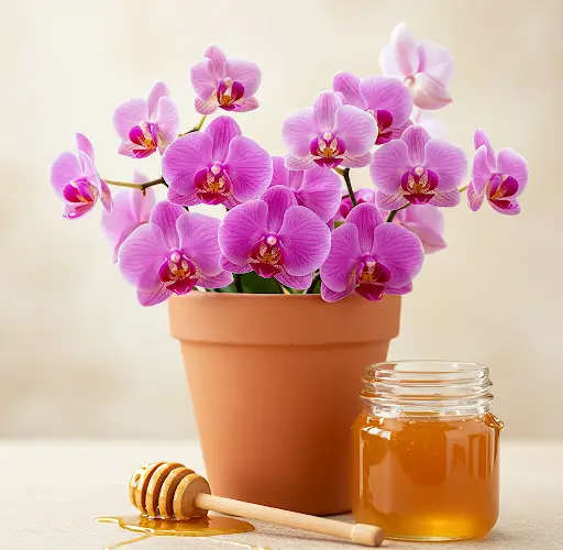 O mel é um fantástico estimulante de crescimento natural e agente antibacteriano que pode ajudar as orquídeas a desenvolver raízes mais fortes, produzir flores mais vibrantes e resistir a doenças.