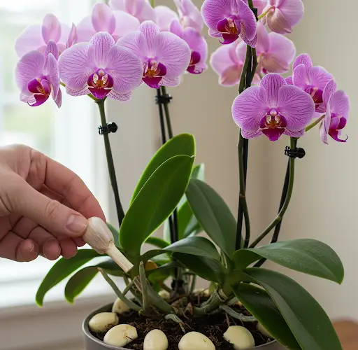 Após um mês , você deverá notar uma melhora significativa na saúde da orquídea. Nesta fase, comece a fertilizar com opções orgânicas, como água de casca de banana, solução de chá preto ou fertilizante de soja . Esses fertilizantes naturais fornecem nutrientes essenciais como potássio, fósforo e nitrogênio, vitais para o crescimento e a floração a longo prazo.
