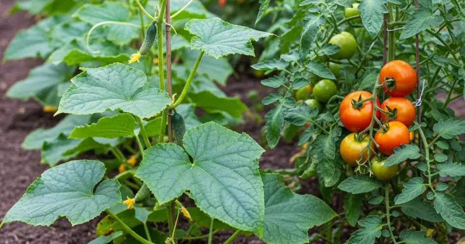 Apoie e faça a poda – Use estacas ou gaiolas para dar suporte às plantas de tomate e manter os pepinos longe do solo. Pode as folhas e os brotos laterais desnecessários para direcionar a energia para o desenvolvimento dos frutos.
