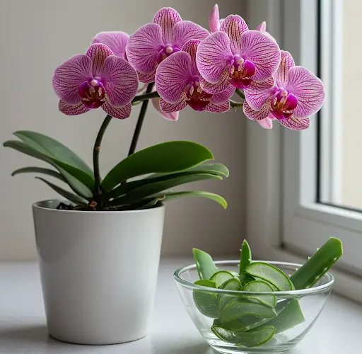 A babosa (aloe vera) é conhecida por suas poderosas propriedades cicatrizantes e antimicrobianas, sendo um excelente tratamento natural para orquídeas com apodrecimento. Para preparar a solução de babosa: